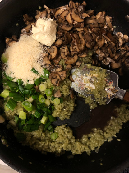 Remove from heat. Stir in the cooked mushrooms & their liquid, the vegan butter, the chopped green onion, and the vegan parmesan.